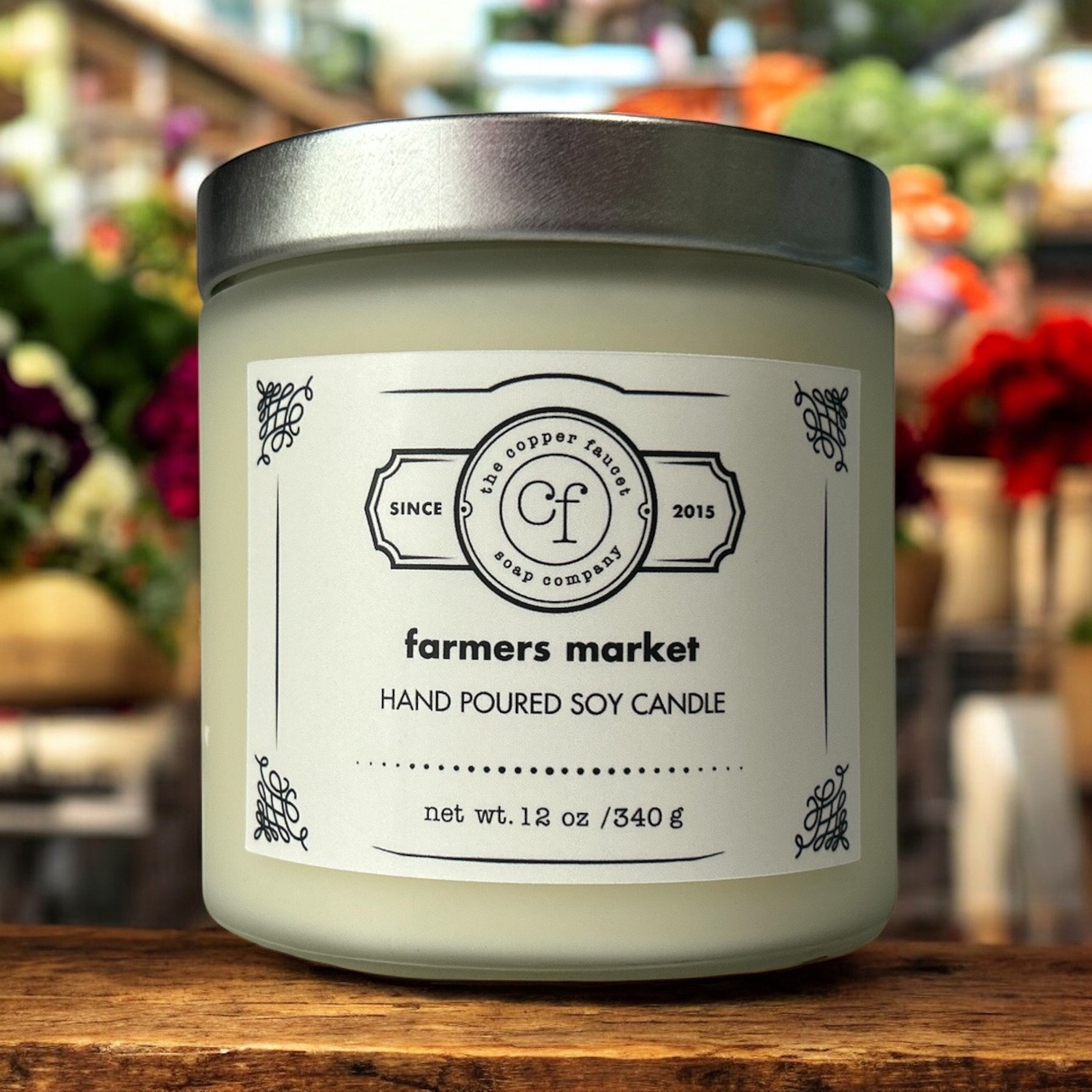 farmers market - this earthy and garden fresh fragrance brings the scent of freshly crushed tomato leaves to life. An unusual but intriguing fragrance, this candle is light and airy and brightens up any space in your home.